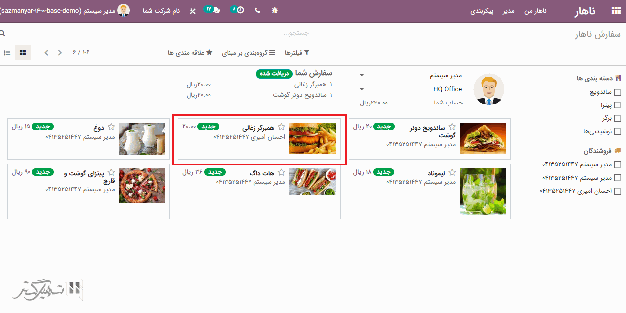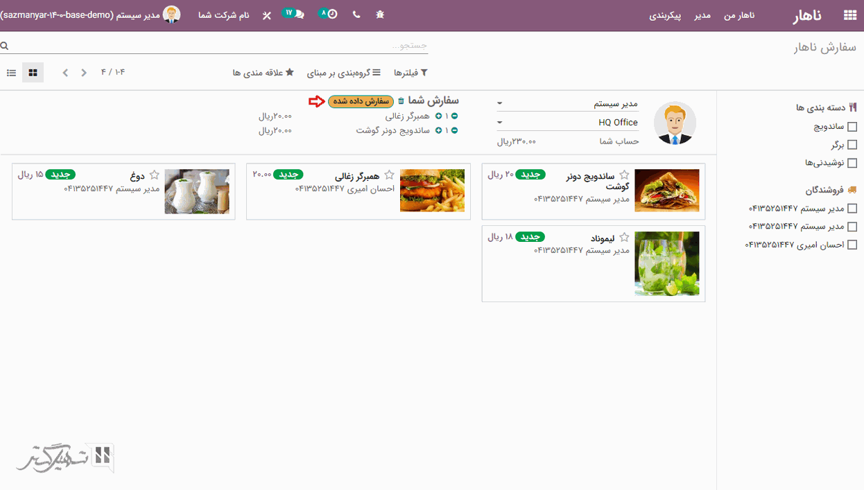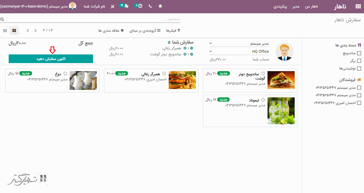 سفارش های ناهار می توانید از طریق داشبورد ماژول ناهار ایجاد کنید. کاربر می تواند برای ثبت سفارش، محصولی را از فرم محصولات لیست شده در داشبورد انتخاب نماید: