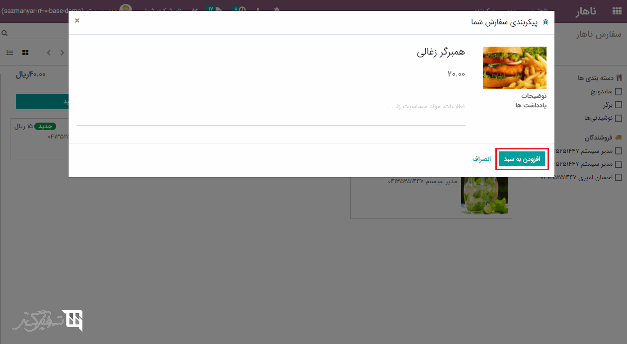 هنگامی که بر روی هر یک از محصولات کلیک کنید، یک ویزارد مانند تصویر زیر در صفحه ظاهر خواهد شد، در فیلد "توضیحات یادداشت ها" می توانید توضیحاتی در مورد حساسیت به برخی مواد یا نمک و قند موجود در غذا را اضافه نمایید. سپس بر روی دکمه "افزودن به سبد" کلیک کنید: