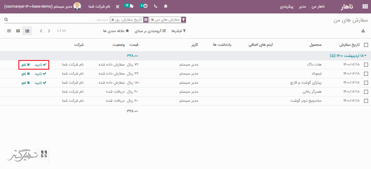 مدیران می توانند برای مشاهده سفارشات ایجاد شده توسط کاربران، به ماژول ناهار> مدیر> سفارش های امروز بروند. مدیر با کلیک بر روی گزینه های "تایید / لغو"، می تواند سفارش ها را تایید و یا لغو کند: