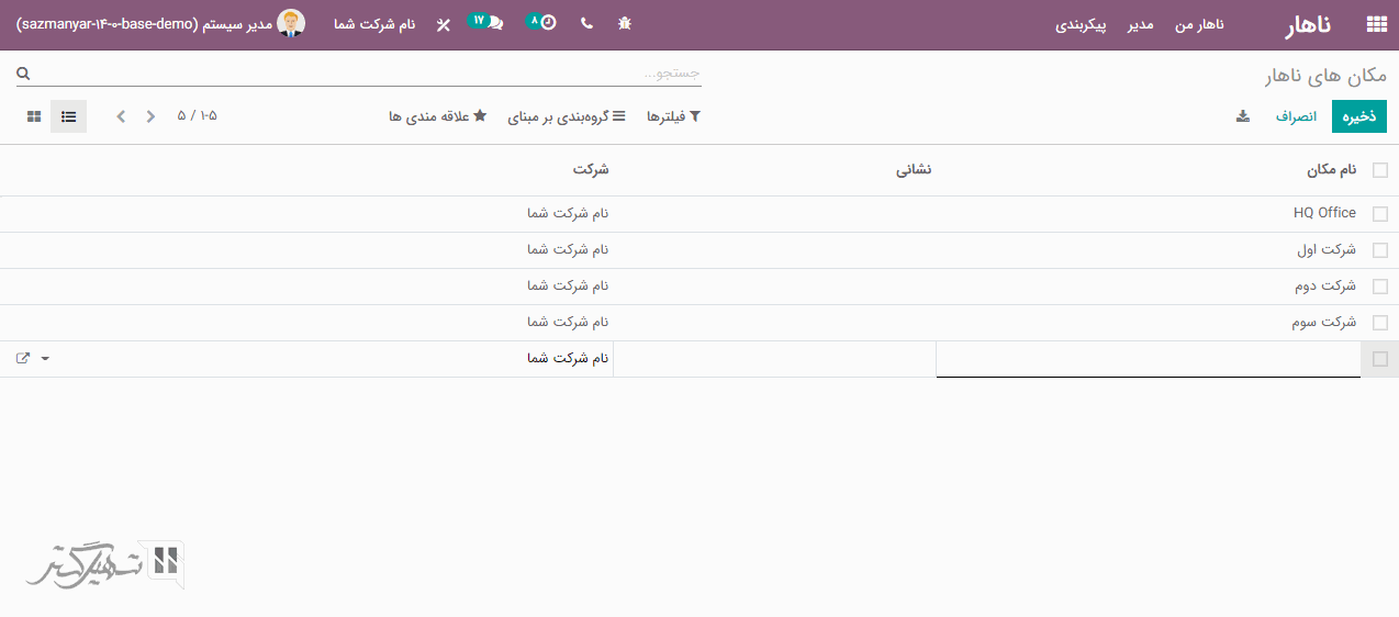 در اینجا می توانید مکان های از قبل ایجاد شده را مشاهده کنید. برای ایجاد مکان جدید، بر روی دکمه "ایجاد" کلیک کنید. در سطر ظاهر شده می توانید نام مکان، نشانی و شرکت را اضافه کرده سپس بر روی دکمه "ذخیره" کلیک کنید: