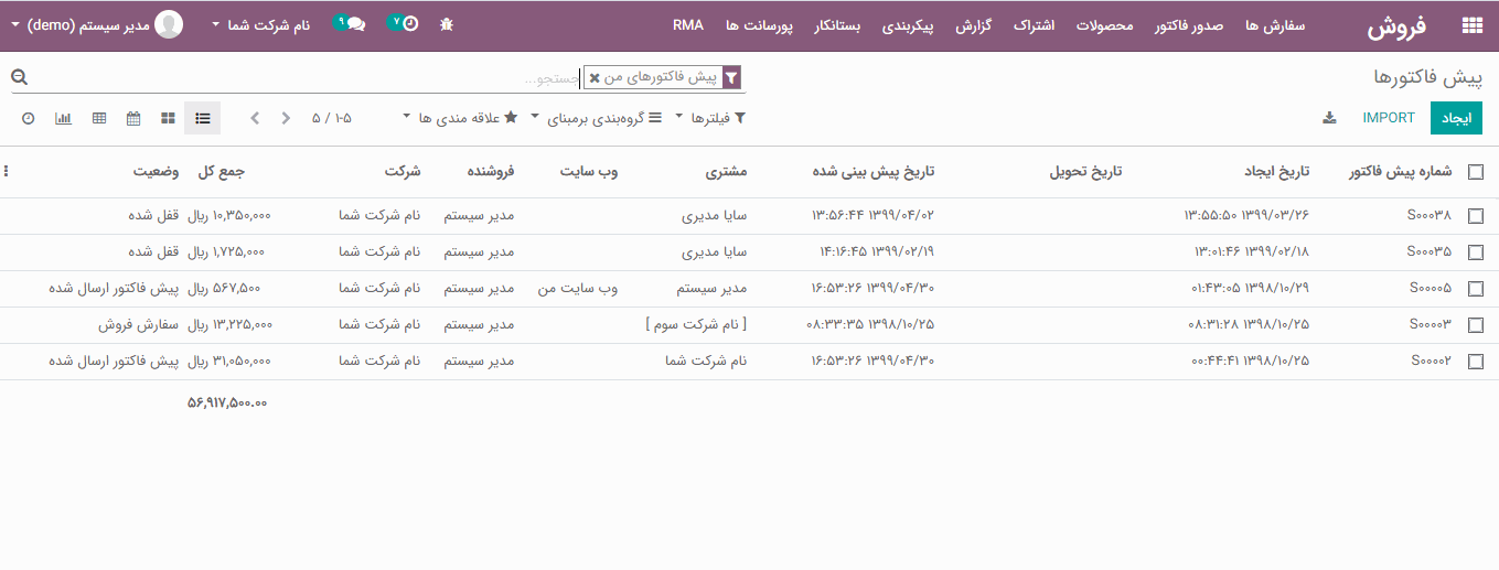 برای ایجاد پیش فاکتور جدید، به فروش > سفارش ها> پیش فاکتور ها بروید و روی دکمه "ایجاد" کلیک کنید.
