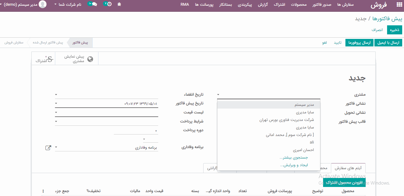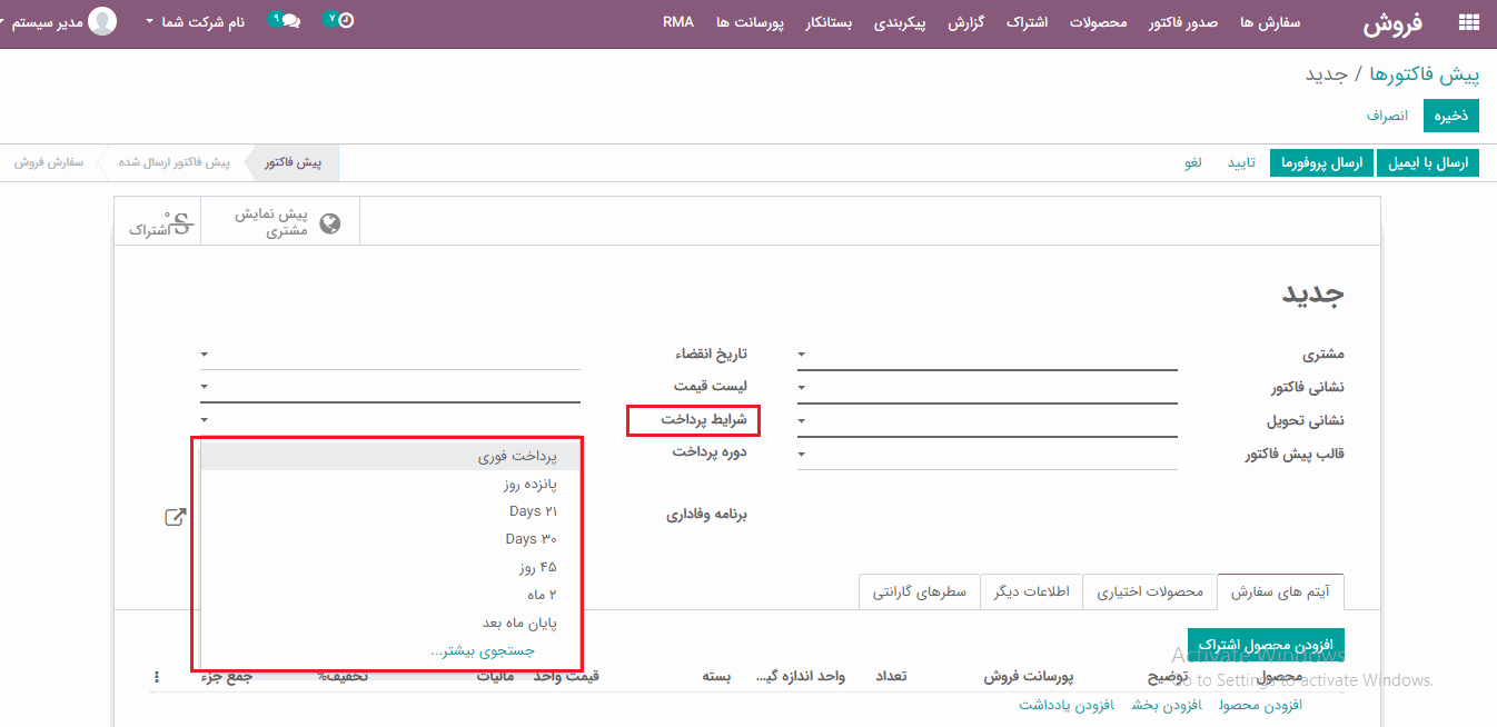 در فرم پیش فاکتور، از