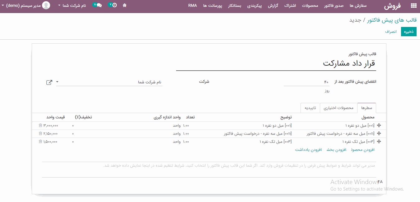 با استفاده از فرمت قالب می توانید یک پیش فاکتور کامل در چند لحظه ایجاد کنید.