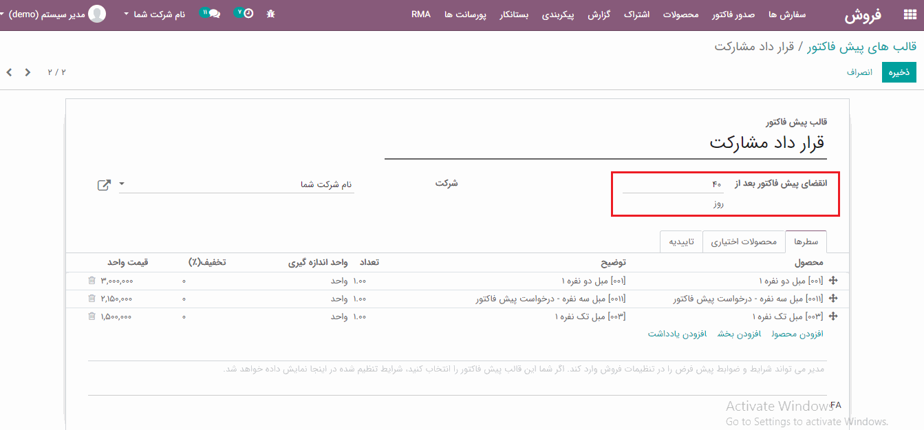 تعیین مهلت پیش فاکتور