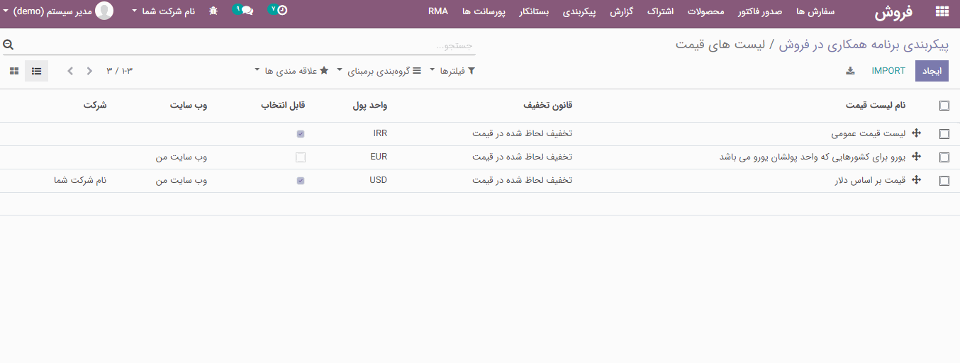لیست قیمت ها، همان لیست قیمت محصولات موجود در فروش است. بسته به نیاز شرکت، می توانید با استفاده از ویژگی "لیست قیمت"، قیمت محصولات یک مشتری/ فروشنده یا تراکنش خاص را به راحتی (کنترل/ تغییر) مدیریت کنید.