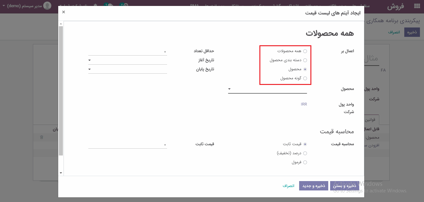 ما بر اساس محصول انتخاب کردیم و در قدم بعدی در فیلد محصول، محصول مورد نظر را انتخاب کرده و "ذخیر و بستن" را میزنیم.