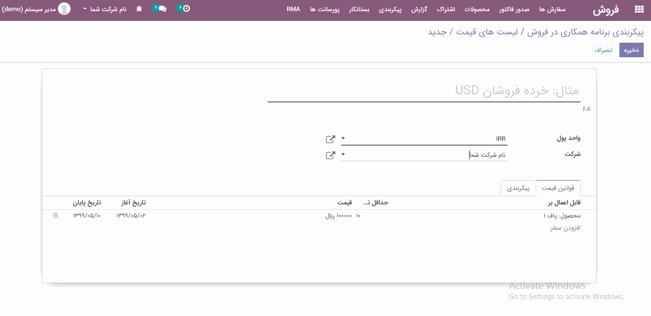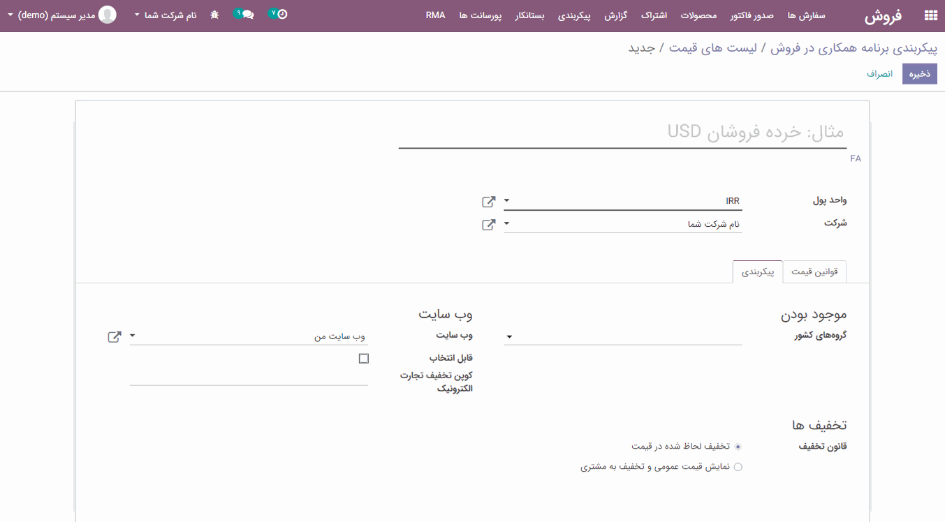 در اینجا پارامترهای خاصی را برای ایجاد لیست قیمت می توانید تعیین کنید: