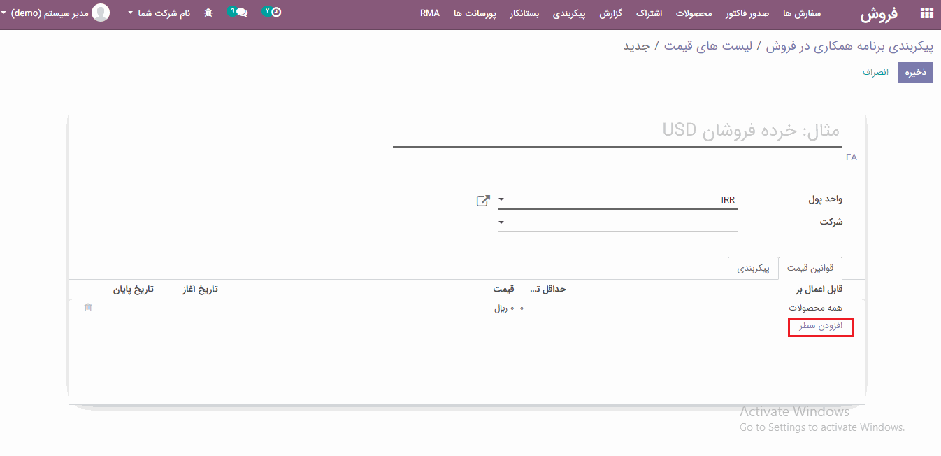 در تب "قیمت گذاری" می توانید با کلیک بر روی گزینه "افزودن سطر" یک قانون جدید قیمت ایجاد کنید.