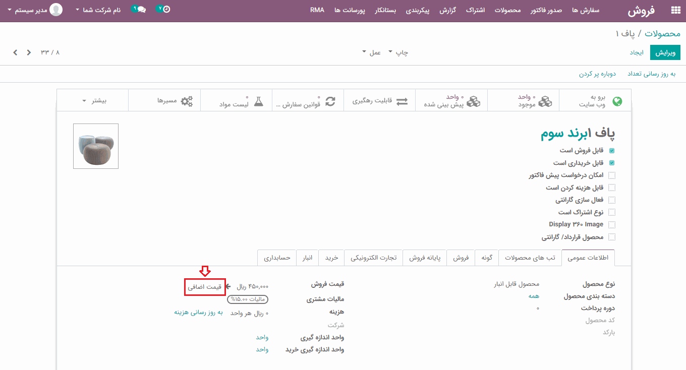 در فروش> محصولات، محصول مورد نظر را انتخاب کرده و سپس در تب اطلاعات عمومی محصول، روی گزینه "قیمت اضافی" کلیک کنید.