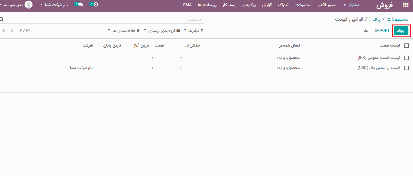 اکنون، شما می توانید با کلیک بر روی دکمه "ایجاد" یک لیست قیمت جدید برای محصول ایجاد کنید.