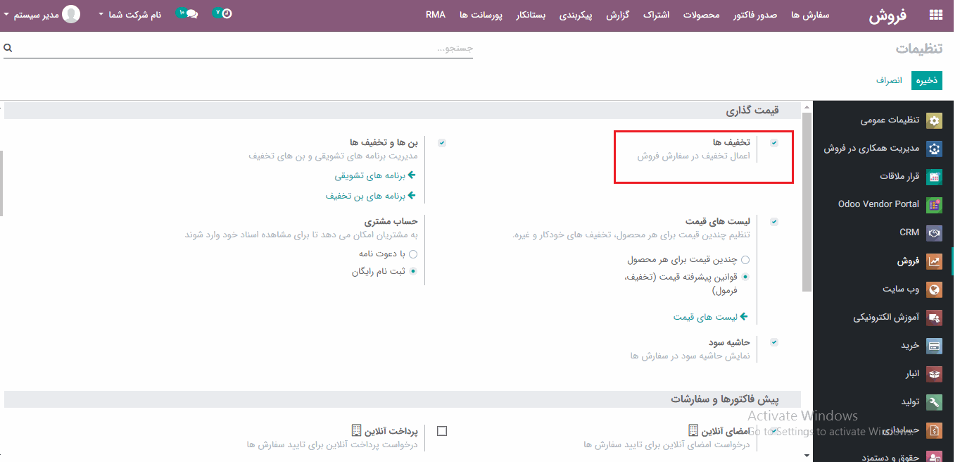 برای فعال کردن ویژگی تخفیف ها در پیش فاکتور، به ماژول فروش> پیکربندی> تنظیمات> تب قیمت گذاری بروید و گزینه تخفیف ها را تیک بزنید سپس تغییرات را ذخیره کنید.