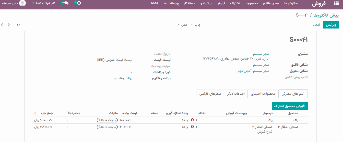 پس از فعال کردن گزینه، می توانید در پیش فاکتور فروش خود، ویژگی "تخفیف %" را در سطر آیتم های سفارش را مشاهده کنید.