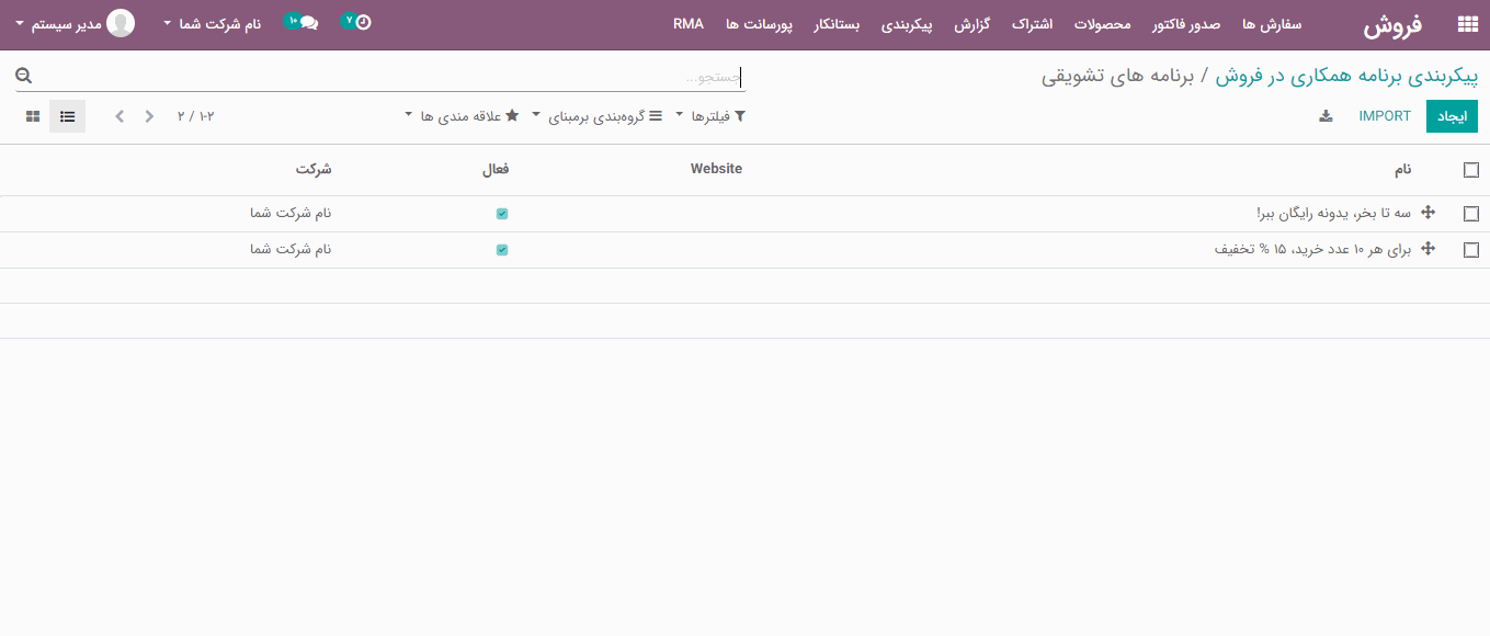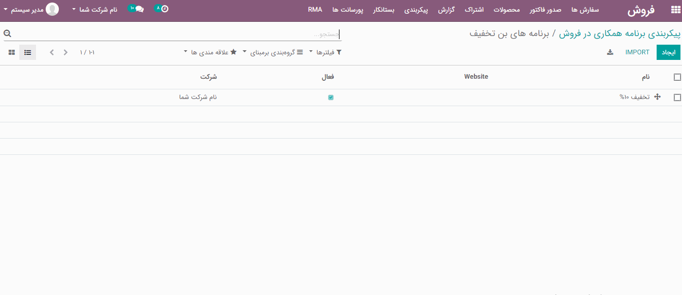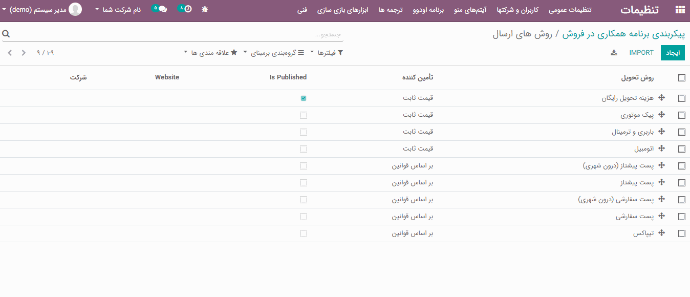 فروش> پیکربندی> تنظیمات
