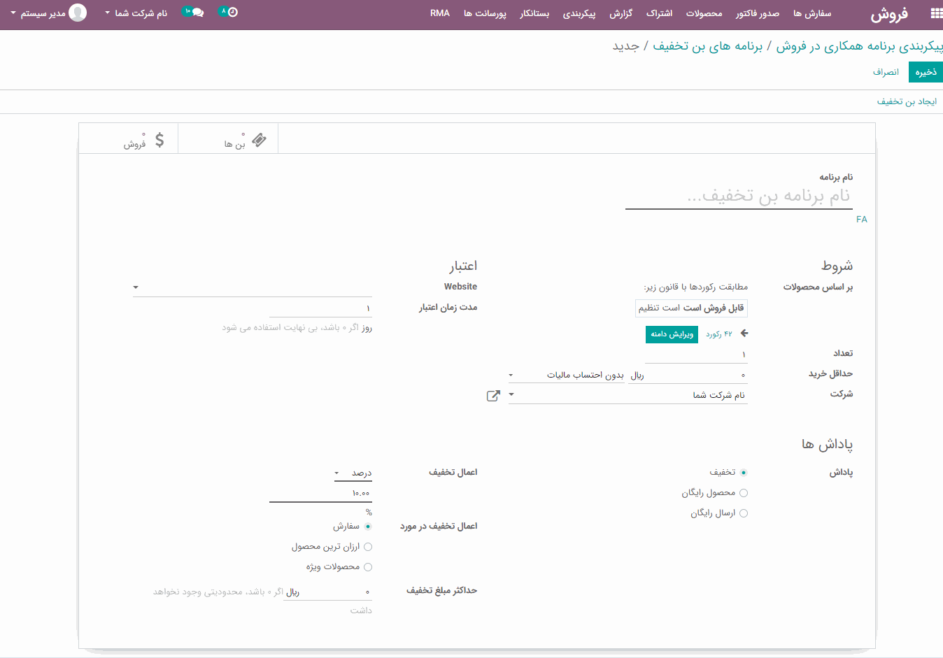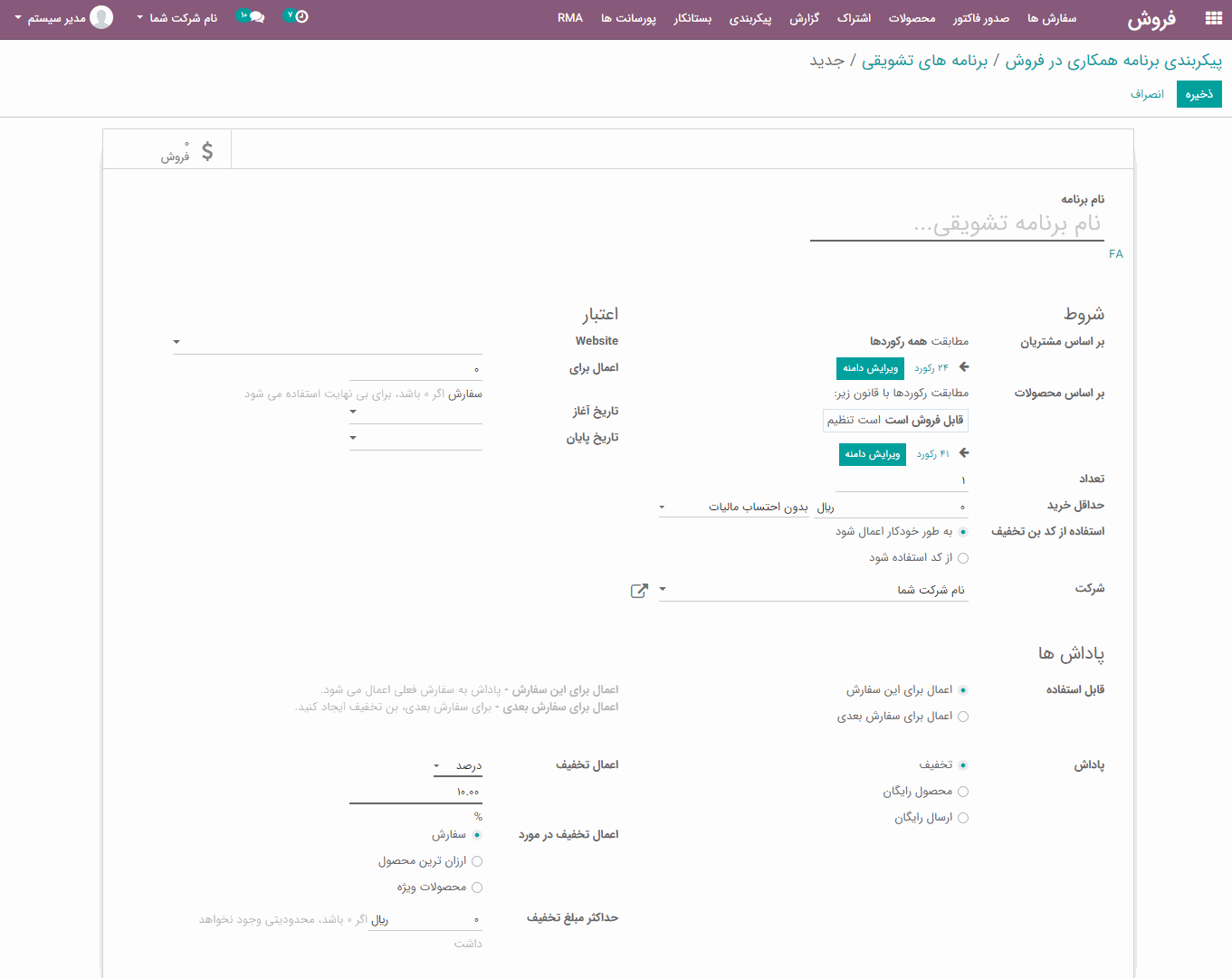 برای ایجاد یک برنامه تشویقی جدید، روی دکمه "ایجاد" کلیک کنید، فرمی مانند تصویر زیر ظاهر خواهد شد: