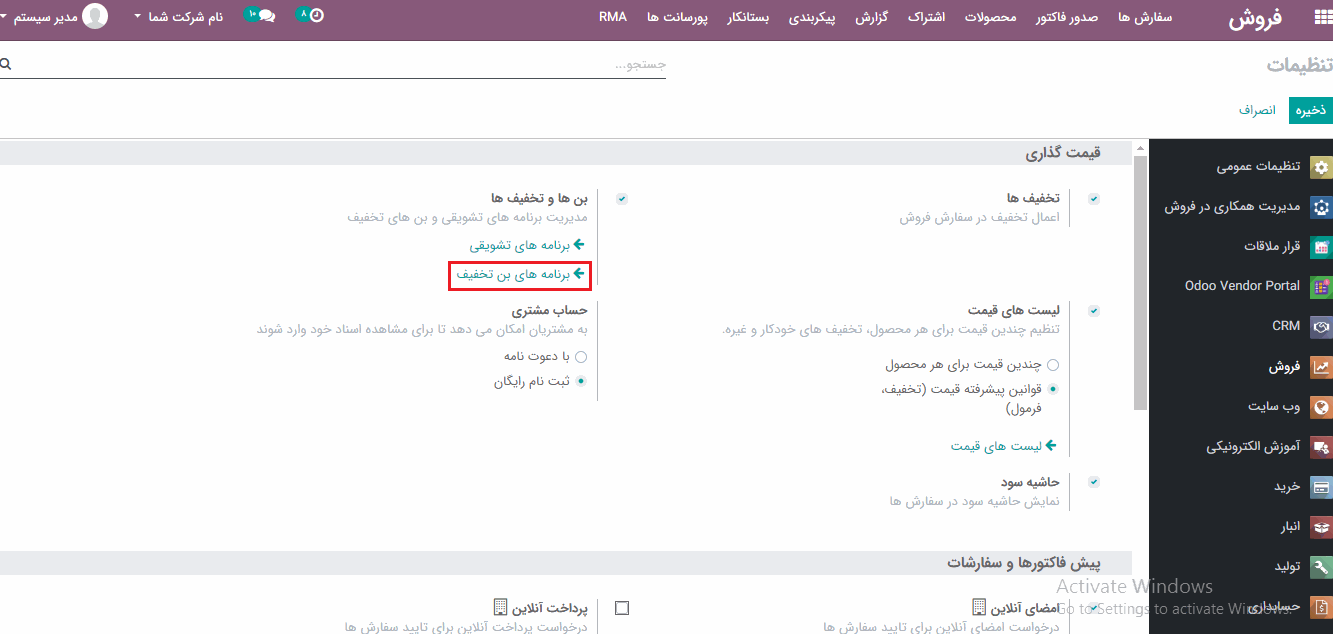 برای فعال کردن این ویژگی پرکاربرد در پیش فاکتور خود، به ماژول فروش> پیکربندی> تنظیمات> تب قیمت گذاری بروید، گزینه بن ها و تخفیف ها را فعال کرده و سپس تغییرات را ذخیره کنید.