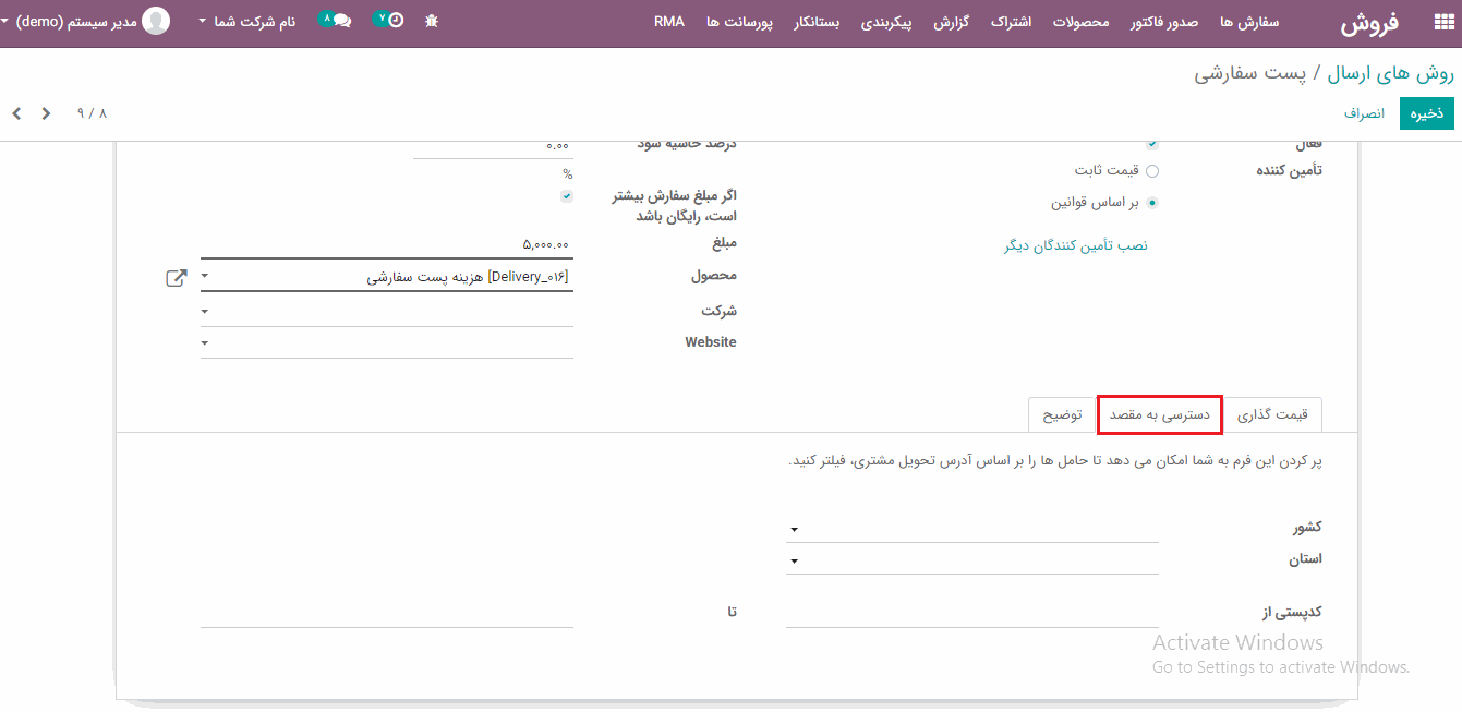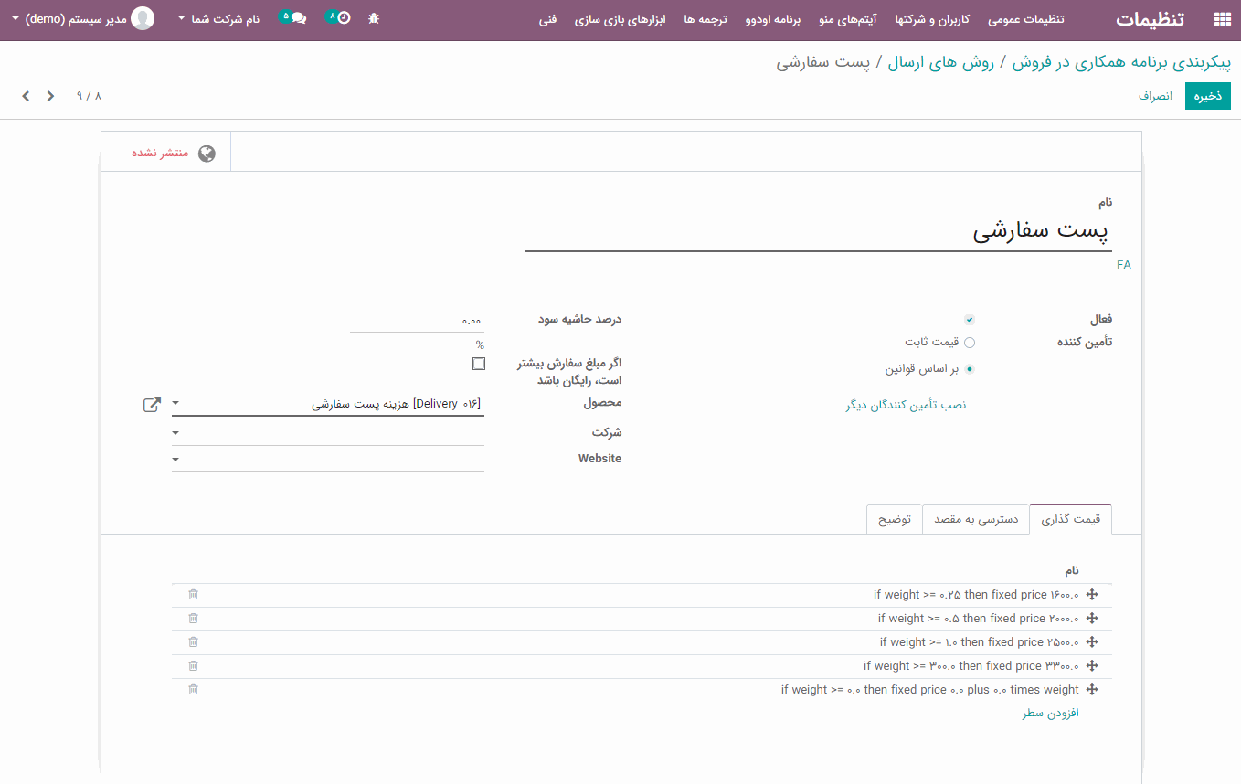 باشد. در صورت انتخاب قیمت ثابت، در آن مرحله هزینه ارسال،