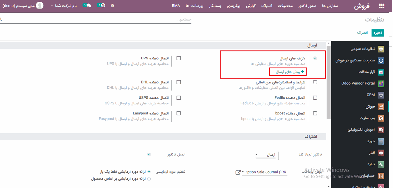 فروش> پیکربندی> تنظیمات> تب ارسال> و از آنجا گزینه "هزینه های ارسال" را فعال کرده