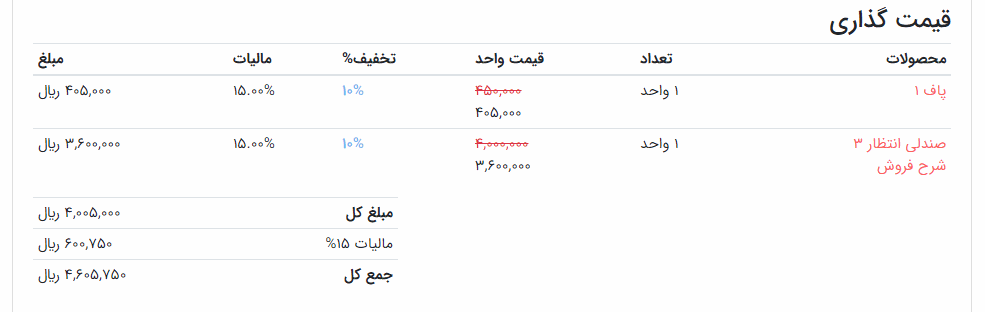 به یاد داشته باشید که تعداد محصولات بر اساس تعداد سفارش و درصد تخفیف را اعمال کنید.