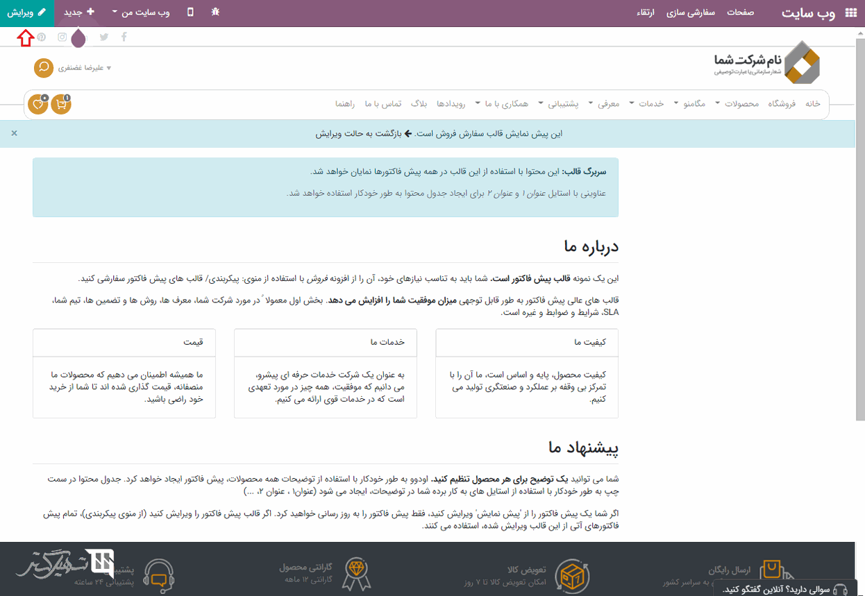 می توان با کلیک کردن روی "ویرایش قالب" در ویرایشگر پیش فاکتور، قالب واسط مشتری را ویرایش کرد.