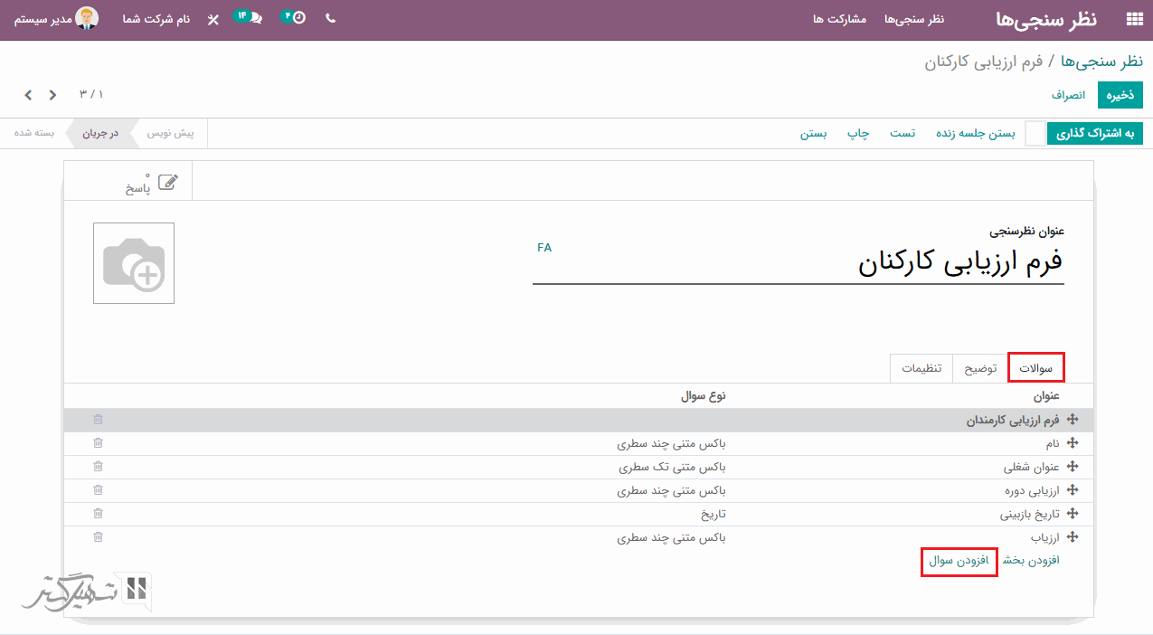 سپس، در تب سوالات، بر روی گزینه "افزودن سوال" کلیک کنید:
