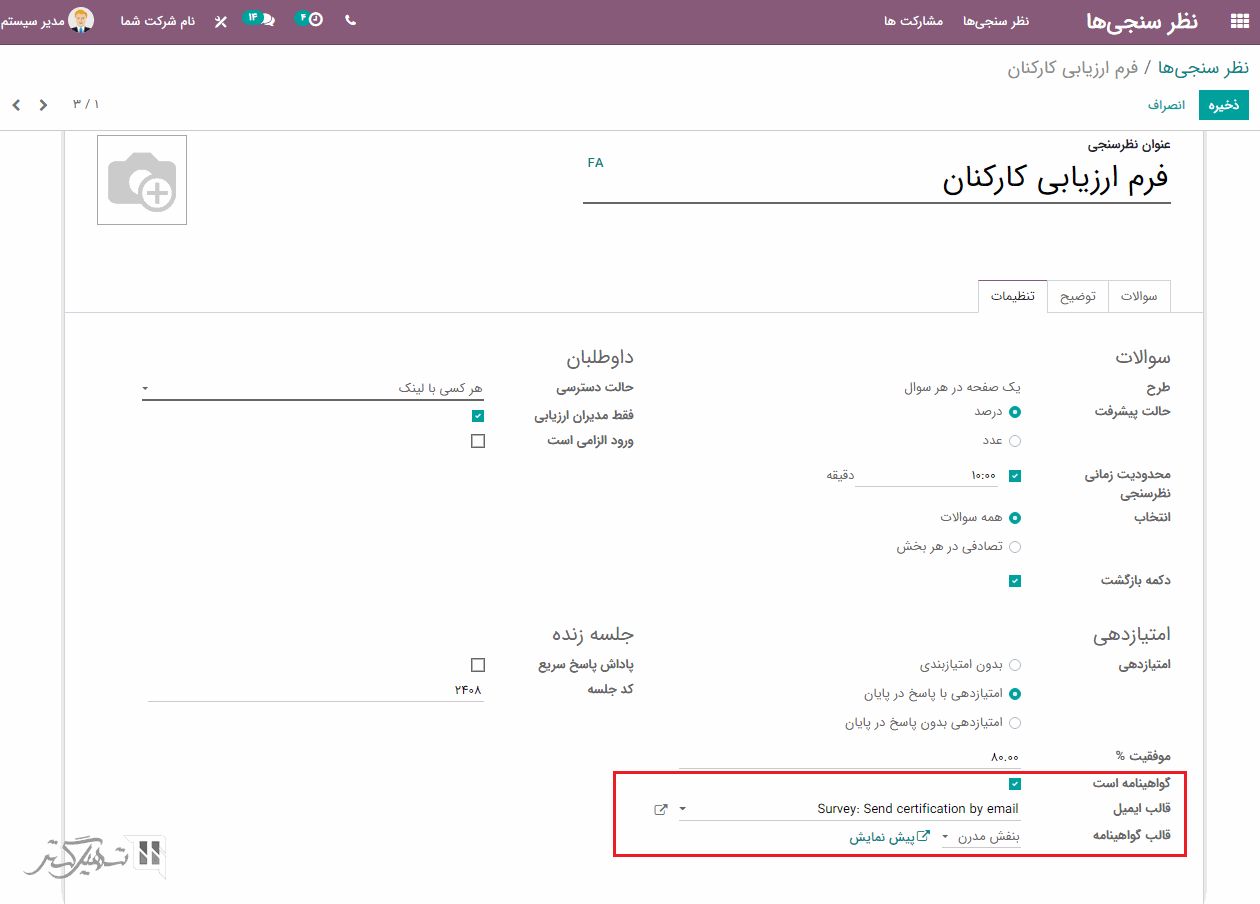 درصد موفقیت کاربر برای دستیابی به نظرسنجی را تعیین کنید. در صورت فعالسازی گزینه "گواهینامه است"، قالب گواهینامه را نیز تعیین کنید. این گواهینامه به طور خودکار از طریق ایمیل برای کاربرانی که با موفقیت آن را به پایان می رسانند، ارسال خواهد شد.
