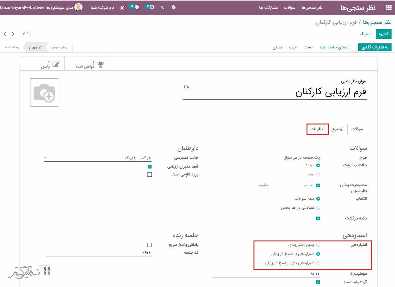 برای سنجش عملکرد پاسخگویی خود یا دانش و اطلاعات در مورد یک موضوع یا رضایت کلی، با استفاده از ویژگی امتیازدهی ماژول نظرسنجی اودوو ، به پاسخ سوالاتتان امتیاز اضافه کنید. این امتیازات جمع بندی می شوند تا به پاسخگویی شما نمره نهایی بدهند.