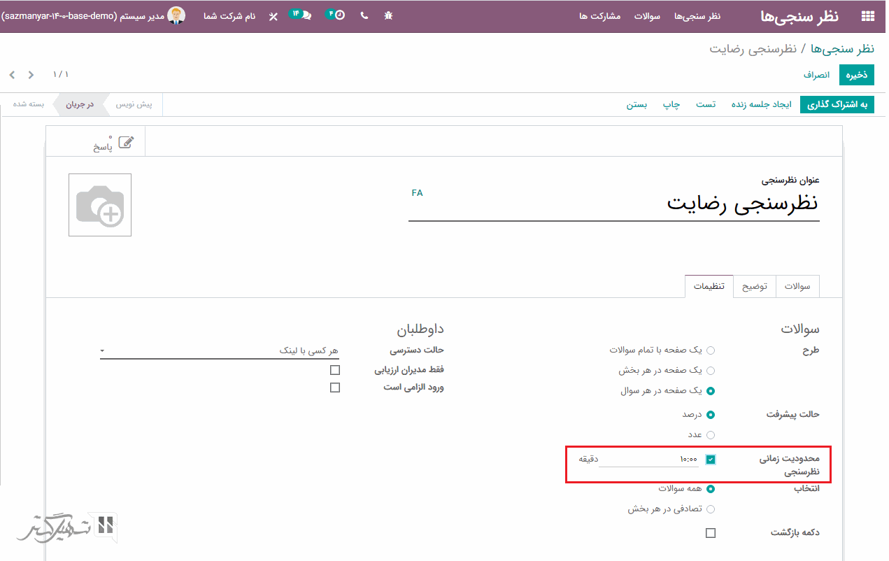 از طریق ماژول نظرسنجی ها> ایجاد> تب تنظیمات، می توانید محدودیت زمانی نظرسنجی هارا فعال کرده و محدوده زمانی که برای این نظرسنجی در نظر گرفته اید، اضافه نمایید.